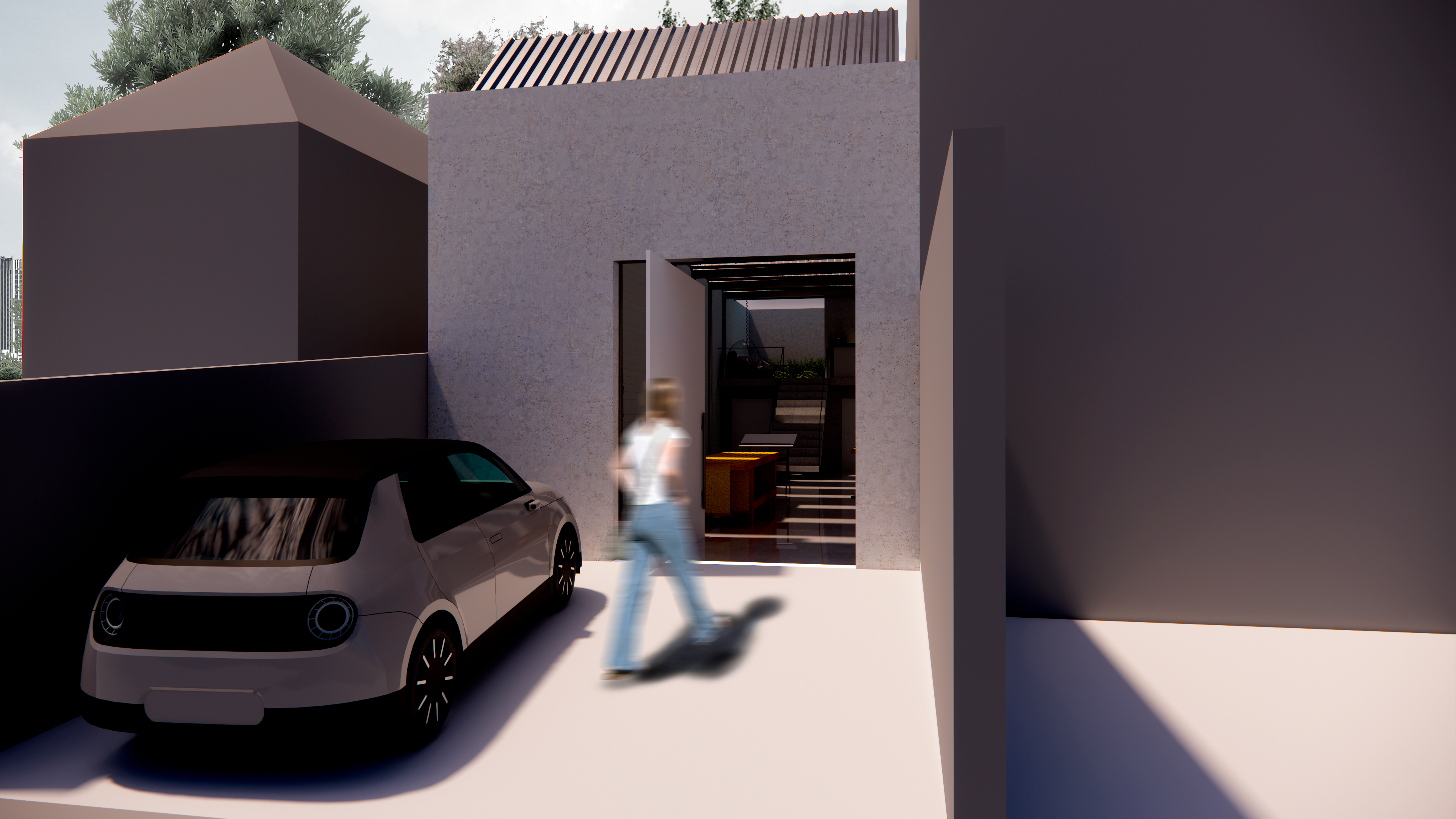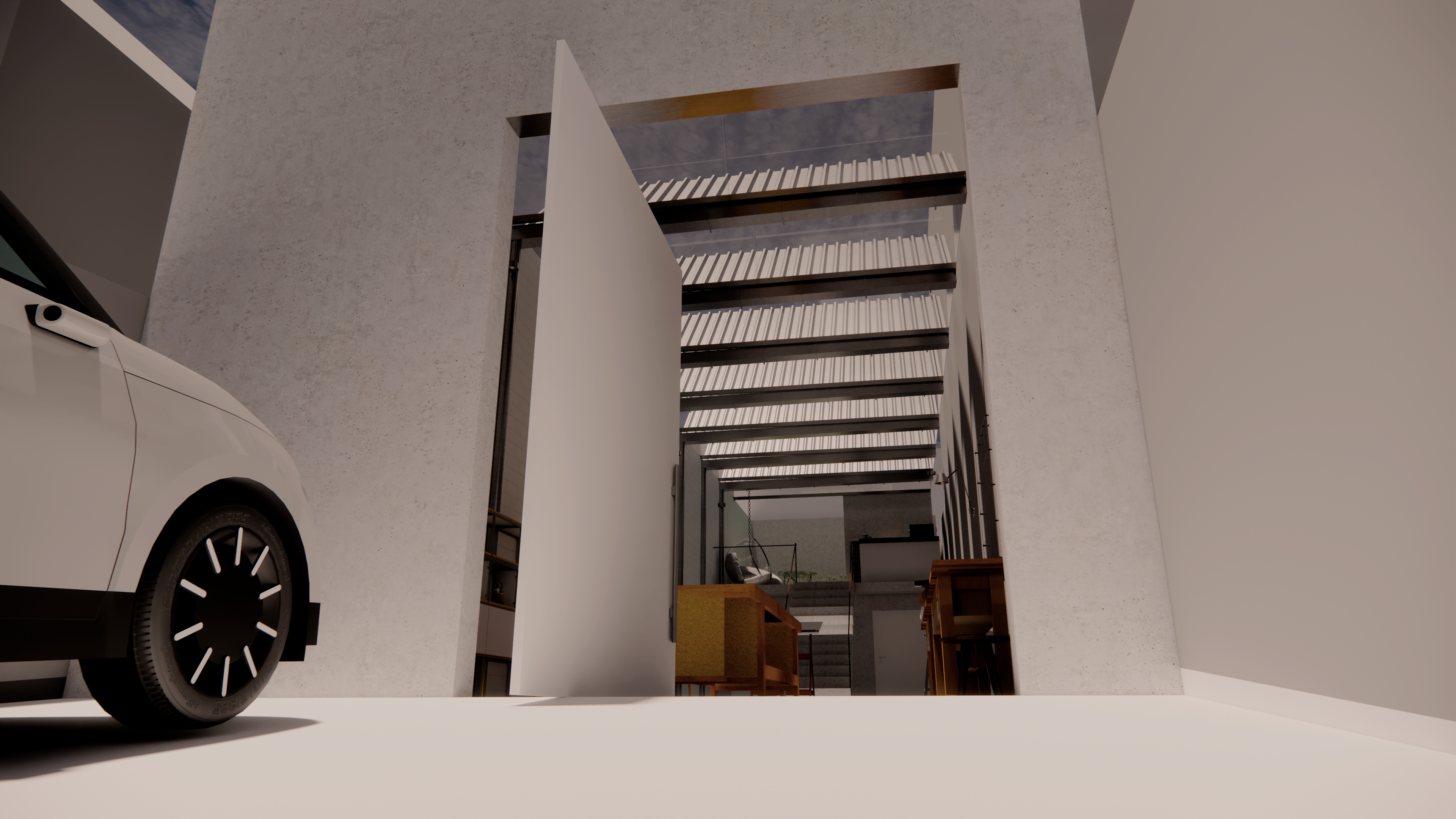 O projeto conta com dois banheiros, um área de lazer superior e um jardim interno, além de um espaço de trabalho amplo e iluminado. Projeto feito no sketchup, com renderização no enscape, e pós-edição no photoshop.